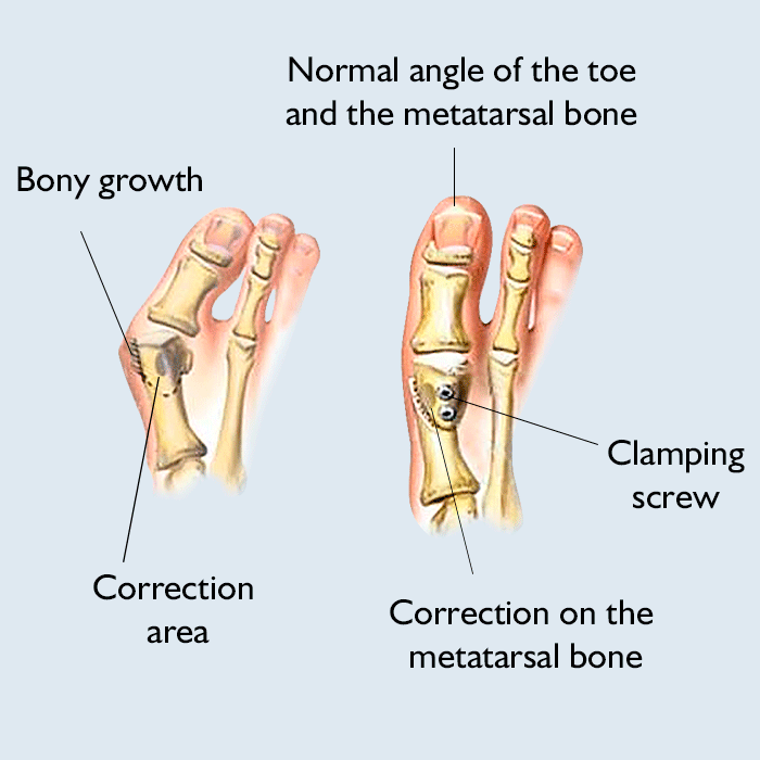 The purpose of the surgery is to restore the original position of the big toe and the metatarsal bone. This can be achieved by various methods; The degree and angle of deformity as well as the patient’s age and physical condition play a significant role in the surgeon’s choice of technique, which will determine how much tissue is removed and whether or not bone repositioning will occur.